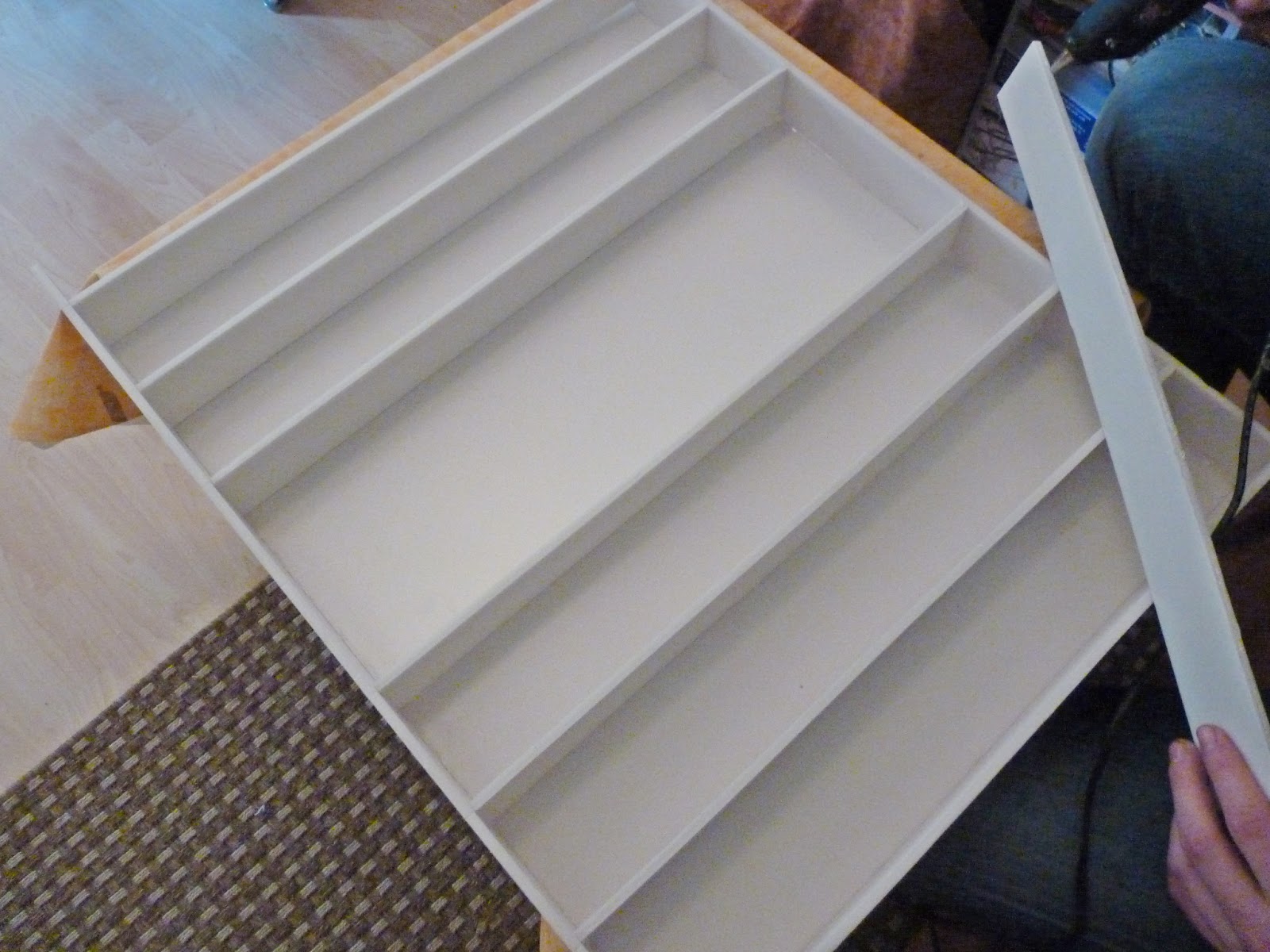 Wie ihr auf dem oberen Foto sehen könnt zieht ihr die Klebelinie auf dem bereits zusammengestecketem Regal um dann die neuen Teile darauf zu kleben.